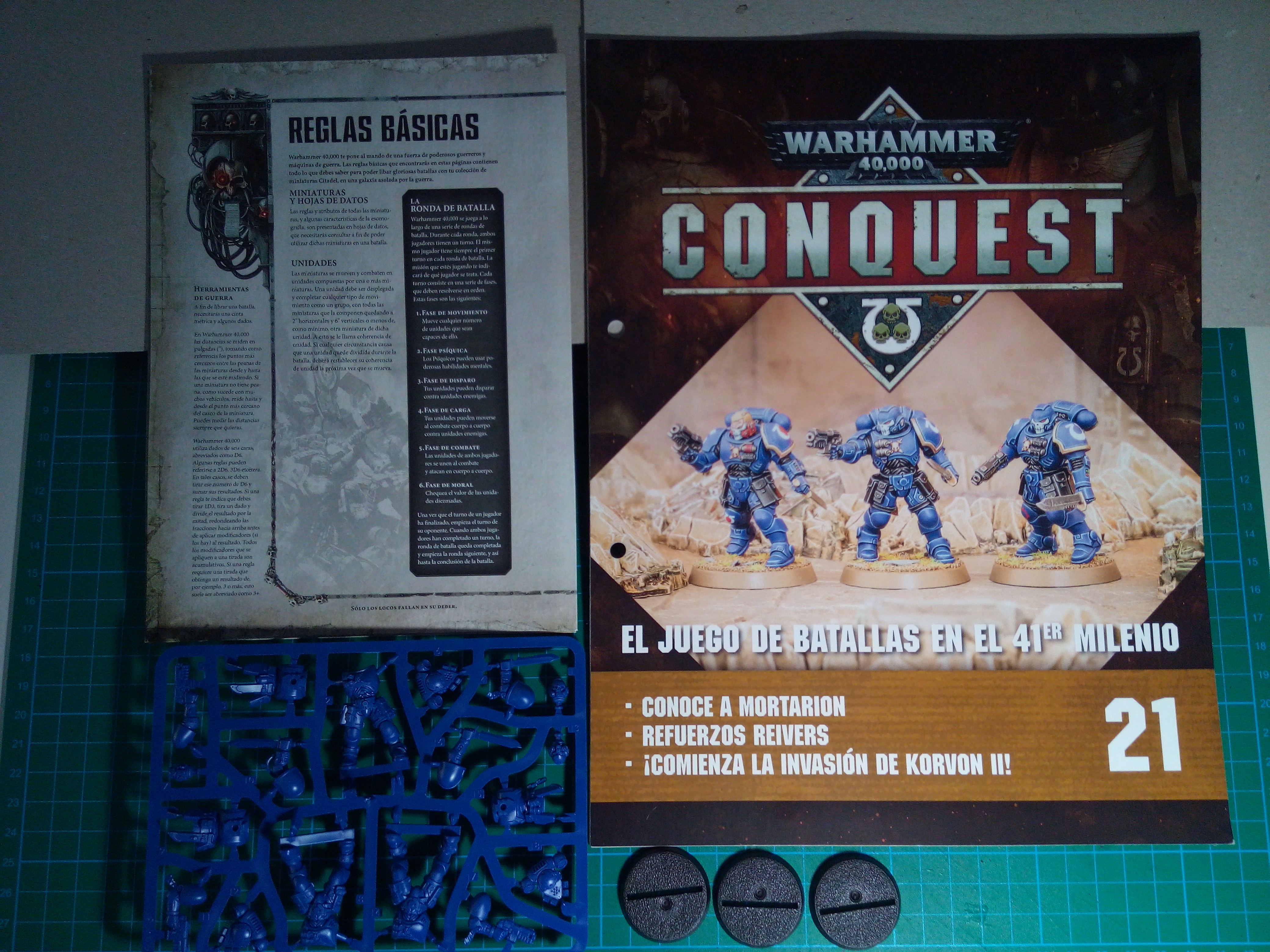 El vigésimo primer fascículo nos trae en portada tres Reivers, miniaturas que lo acompañan, y una tarjeta de referencia de reglas. Y como puntos de interés nos mencionan, conoce a Mortarion, refuerzos Reivers y ¡Comienza la invasión de Korvon II!