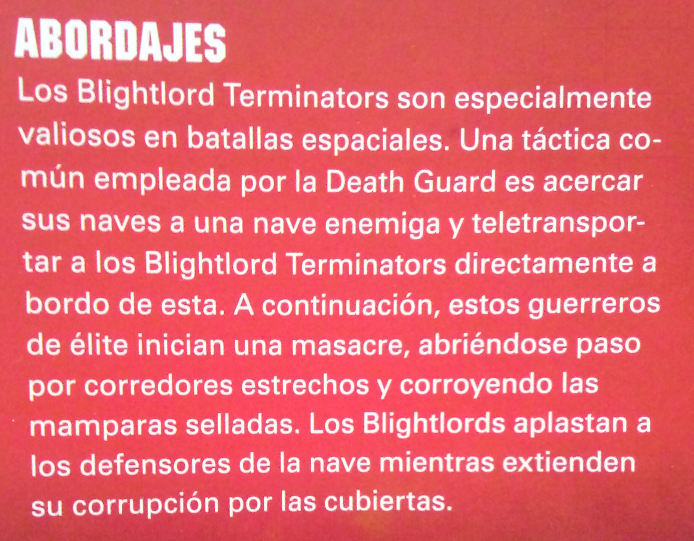 Por último nos encontramos con los Blightlord Terminators. Estos son Plague Marines veteranos con armaduras Terminator Cataphractii. Aunque su avance es lento, son increíblemente duros y portan variedad de armas mortíferas. Están rodeados por un aura de entropía que fluye de ellos en oleadas y pudre la carne y corroe el metal. Los Blightlords suelen acompañar a los Lords of Contagion actuando como guardaespaldas formando una poderosa fuerza de asalto de elite.
