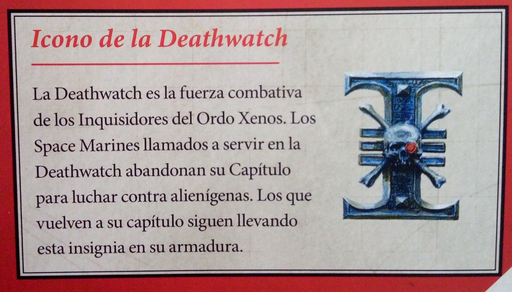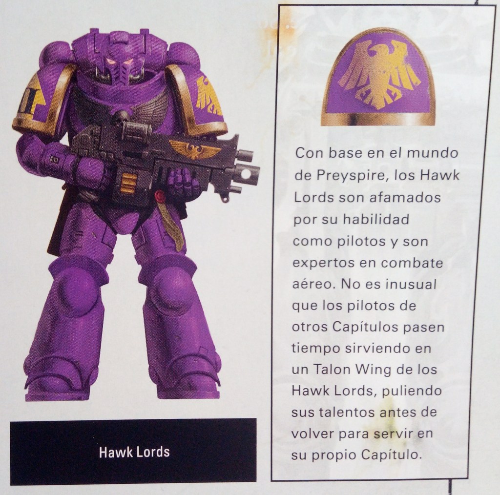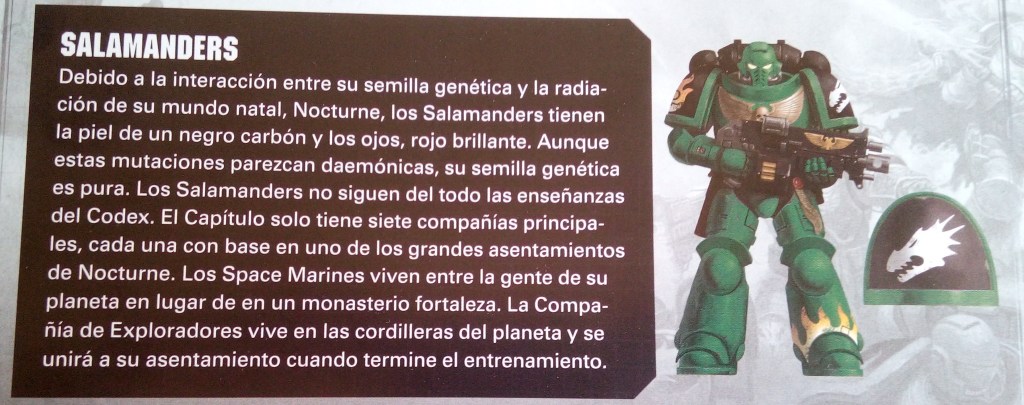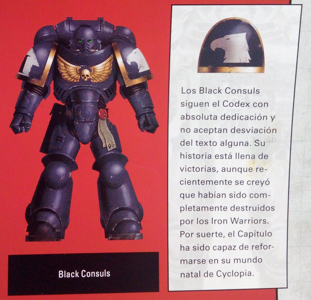 Comenzamos por la Organización del Capítulo. Los Space Marines siguen las enseñanzas del Emperador y los Primarcas. Cada Capítulo es liderado por un Señor del Capítulo y la mayoría se organiza de acuerdo al Codex Astartes, un documento escrito por Roboute Guilliman hace miles de años. Se trata de un detallado manual de instrucciones. Sus páginas explican cómo debería organizarse, funcionar y guerrear un Capítulo. La organización del Codex permite una estructura de mando muy flexible lo que permite a los Capítulos combatir como varias fuerzas separadas. Es raro que un Capítulo luche en conjunto. Los Capítulos que siguen el Codex se dividen en diez compañías. Cada una de ellas suele estar dividida en diez escuadras de diez guerreros. También tienen acceso a una amplia gama de vehículos blindados, naves de asalto, motos y una flota para transportarlos a la batalla.