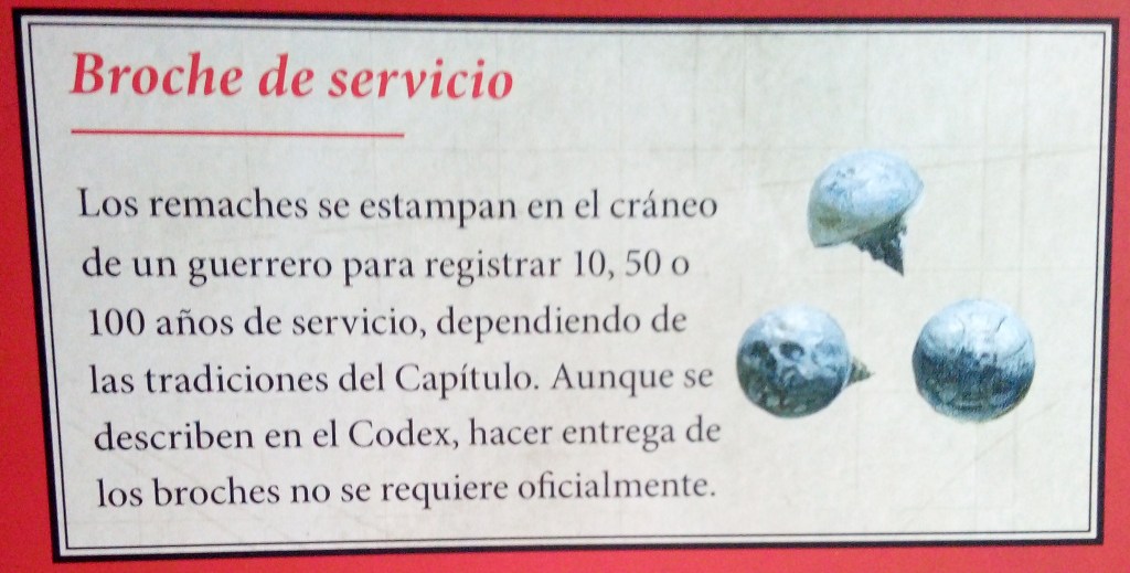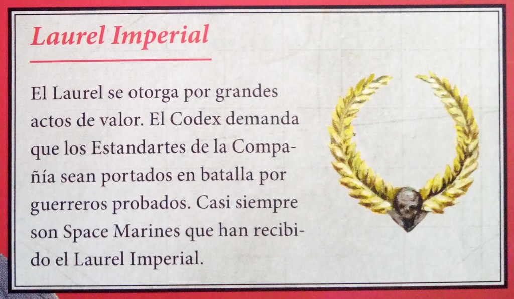 Continuamos con las insignias de Honor. Estas insignias se conceden a los guerreros Space Marines por valentía o habilidad excepcional en combate. Son una parte importante del ritual de guerra, y los guerreros se enorgullecen enormemente al exhibir los símbolos en su armadura de ceramita. Los Marines que han ganado estas insignias son muy respetados.