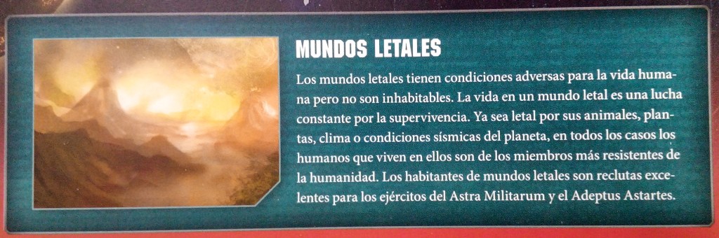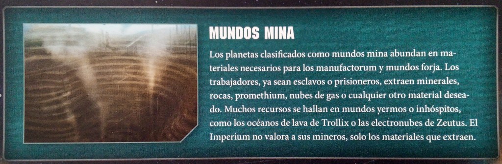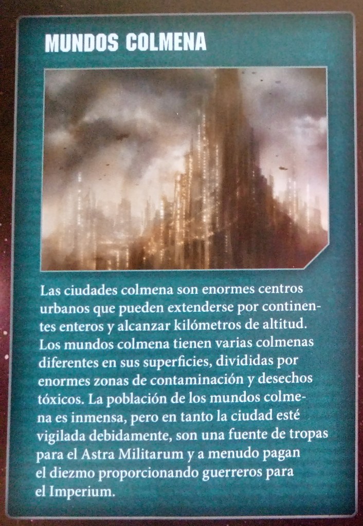 Seguimos dando un pequeño paseo por los Mundos del Imperium. El numero exacto de planetas habitados por ciudadanos del Imperium es desconocido. Se colonizan planetas todo el tiempo, así como se pierden por los enemigos la Humanidad, pero las distancias, las guerras y los conflictos suele significar que tarden siglos en ser reconocidos como parte del Imperium. La Humanidad ha establecido colonias en muchos tipos de mundos, desde rocas sin atmósfera hasta junglas profunda. Estos planetas no solo tiene entornos distintos, sino que a menudo papeles diferentes que desempeñar. Algunos son mundos agrícolas, otros mundos forja..