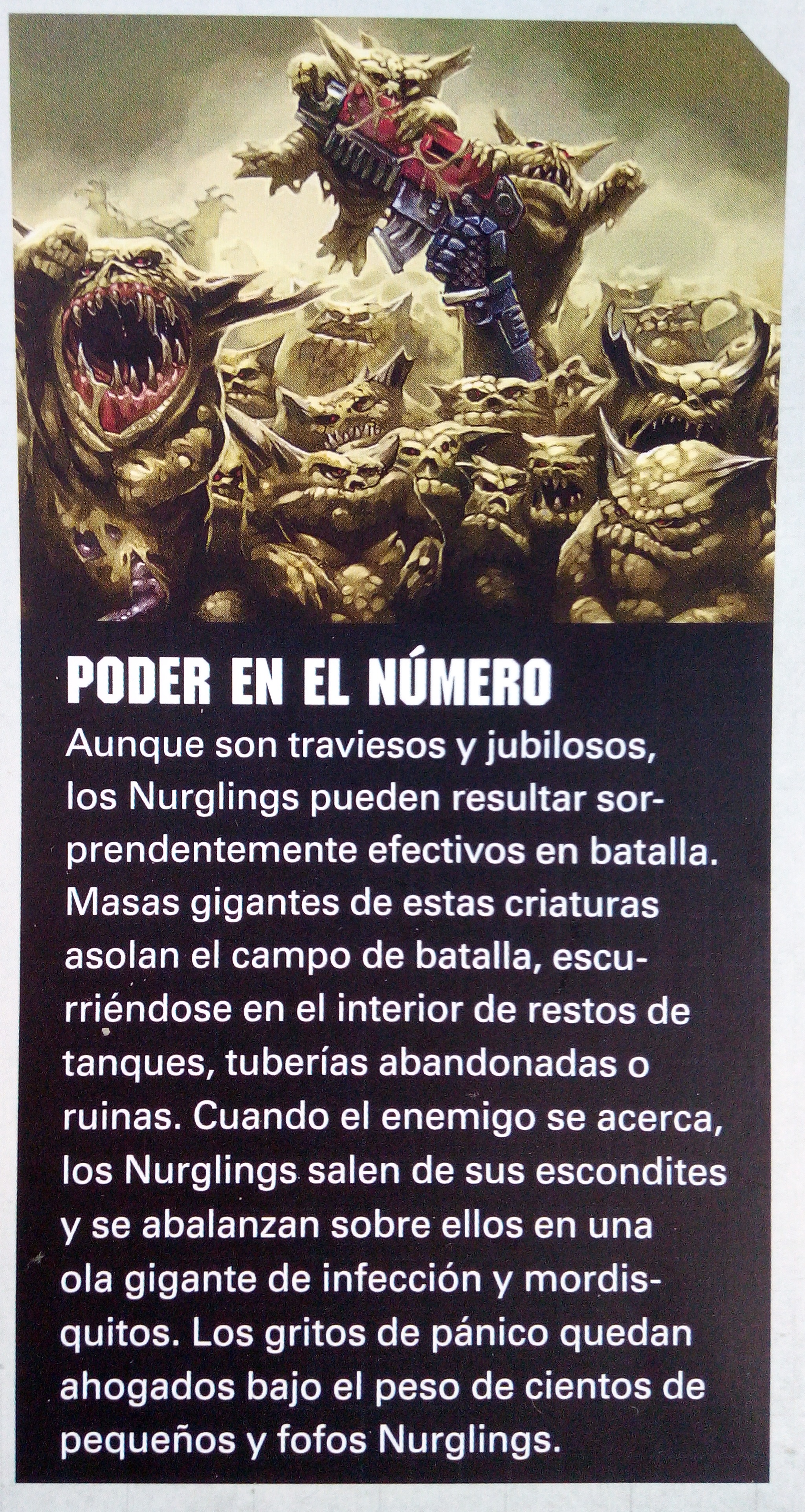 Los Nurglings son los siguientes en hacer su aparición. Pequeños diablillos de plaga con colmillos como agujas son la diminuta imagen del propio Nurgle. Se reúnen en grupos grandes y trepan sobre sus enemigos en una marea de mordiscos y arañazos. Plagados de enfermedades, cada pequeño mordisco no tarda en pudrirse y ennegrecerse a medida que la infección se propaga.