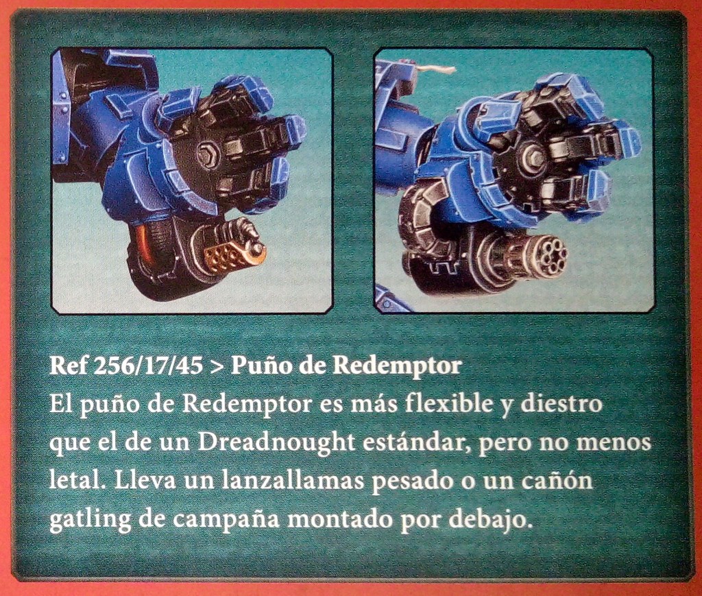 Los Primaris Space Marines no son la única adición nueva a las fuerzas de los Adeptus Astartes. Los Redemptor Dreadnoughts son mucho más grandes, potentes y están mejor diseñados que los anteriores Dreadnoughts. Estas máquinas de guerra gigantes reducen a los enemigos a astillas de hueso y tripas. Un guerrero sepultado en un Redemptor Dreadnought puede controlar su máquina a niveles de destreza y velocidad sorprendente, pero la experiencia los agota rápidamente. Los potentes sistemas de un Redemptor Dreadnought matarán al piloto con el tiempo.