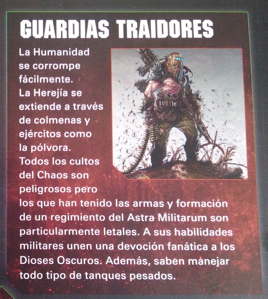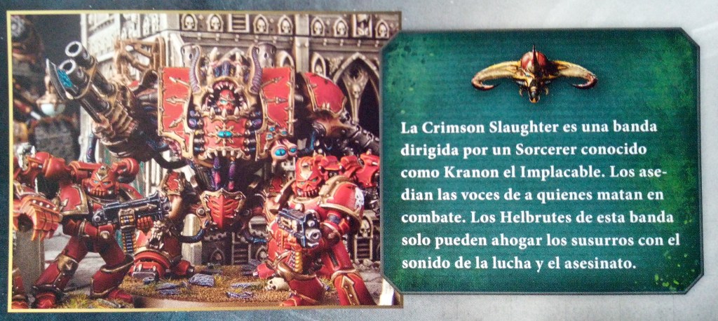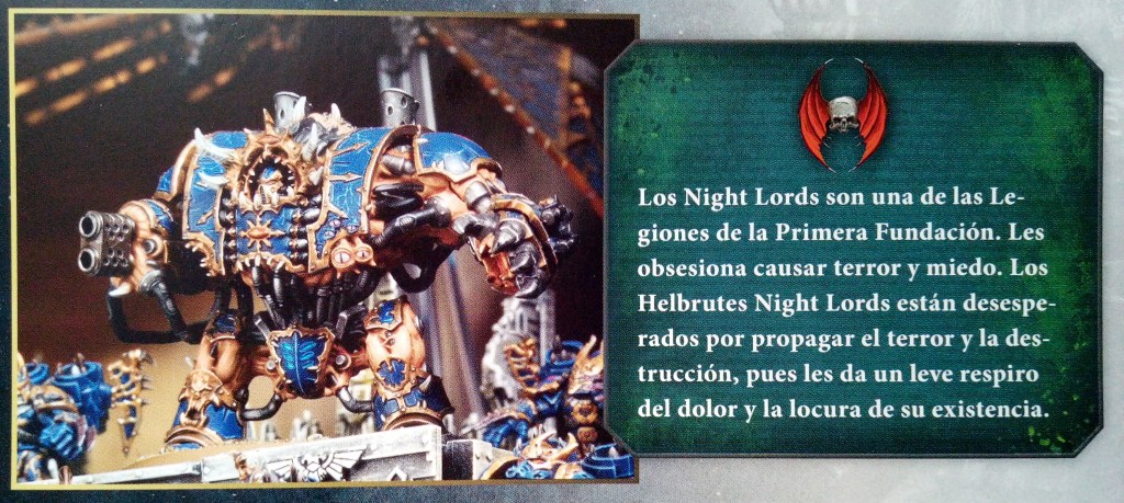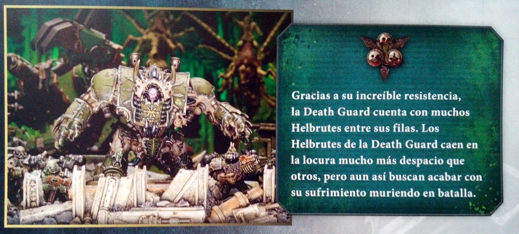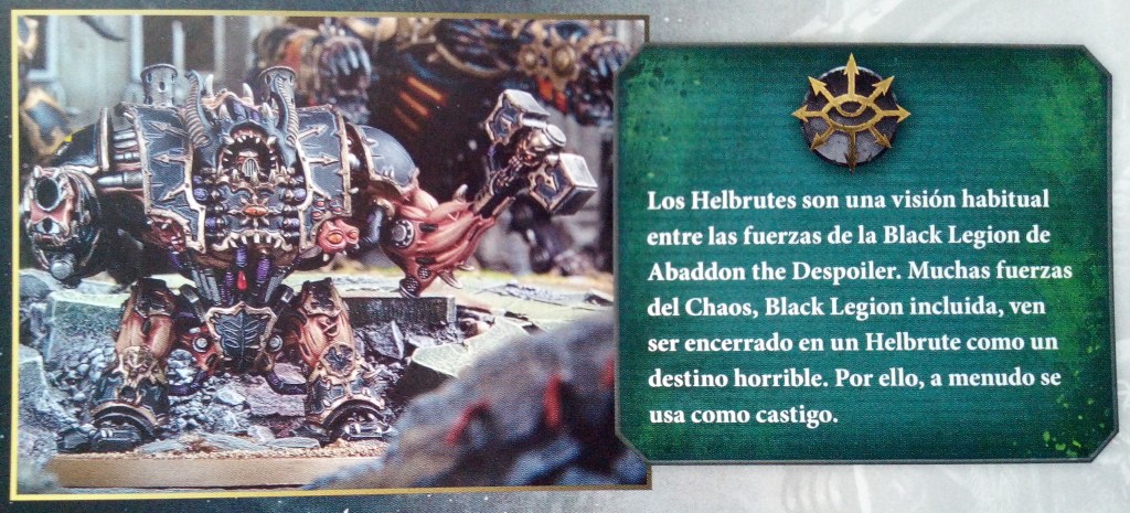 Continuamos con los Hellbrutes. Estos son las versiones retorcidas por el Chaos de los Dreadnoughts. Un Chaos Space Marine tullido yace en el interior de esta repugnante combinación de carne y metal. Son una visión común entre los Chaos Space Marines, aunque el dolor y el horror de esta experiencia vuelve locos a la mayoría de Hellbrutes. Buscan acabar con su sufrimiento mediante la destrucción en batalla.