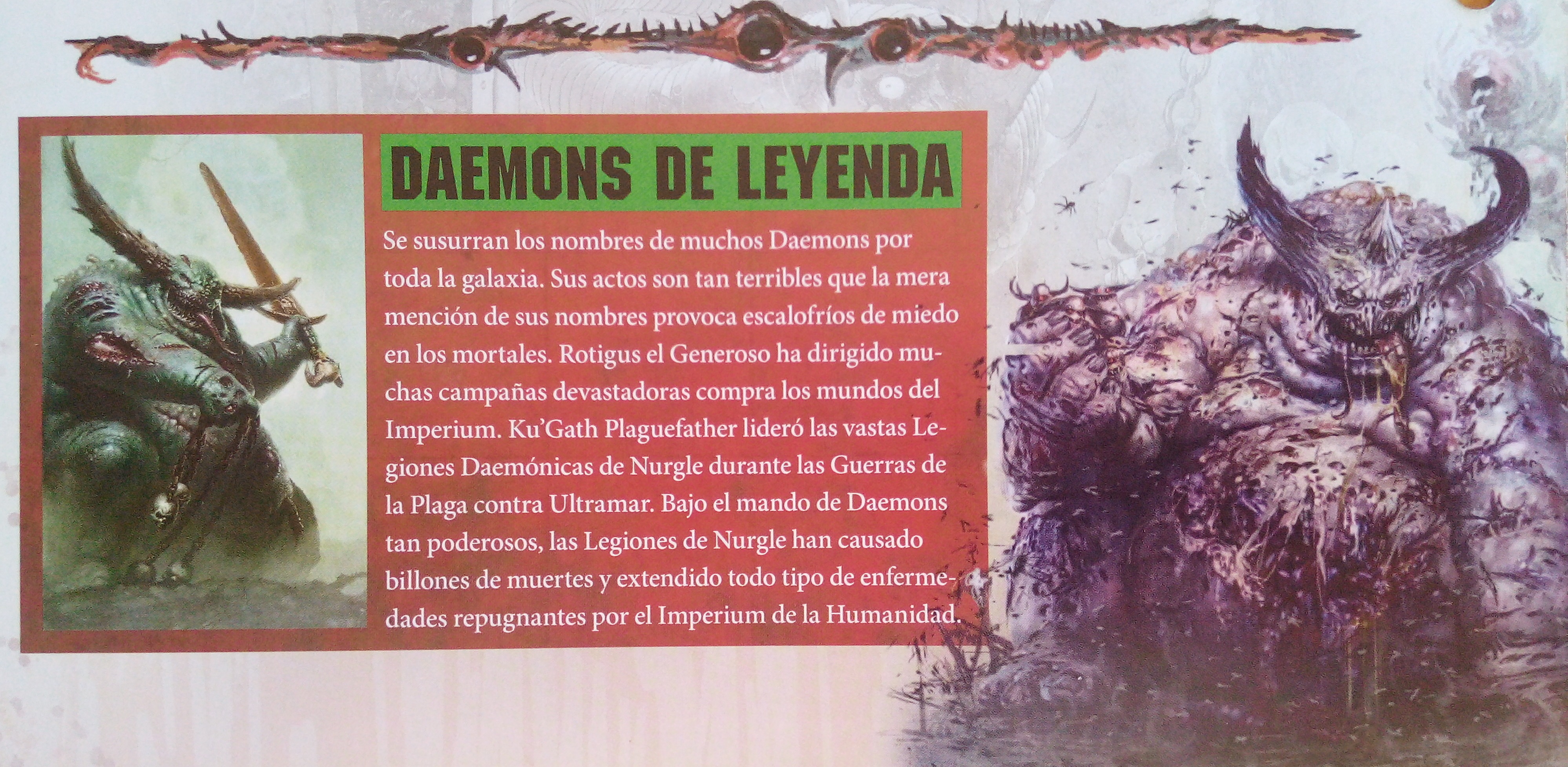 A continuación nos presentan a los Daemosns del Chaos, pesadillas creadas de los pecados y vicios de las criaturas mortales. La apariencia y comportamiento de un Daemon dependen del dios que lo cree. Por ejemplo, Khorne, el Dios de la Batalla, crea criaturas agresivas ansiosas por asesinar y destruir. Nurgle, por otro lado, crea horrores putrefactos que provocan revulsión en quienes las contemplan.