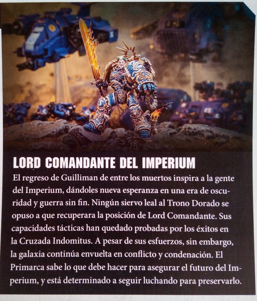 Lo siguiente que nos presentan es a Roboute Guilliman, Primarca de los Ultramarines. El hijo Vengador, el Unificador y el Verdadero Señor de Ultramar. Luchó batalla tras batalla en nombre de su padre, el Emperador de la Humanidad. Compartía su visión de una nueva era de la Humanidad. Desafortunadamente la Herejía de Horus destrozaría ese sueño. Fue Guilliman quien tomó la espada de su padre y juró honrar el legado del Emperador caído.
