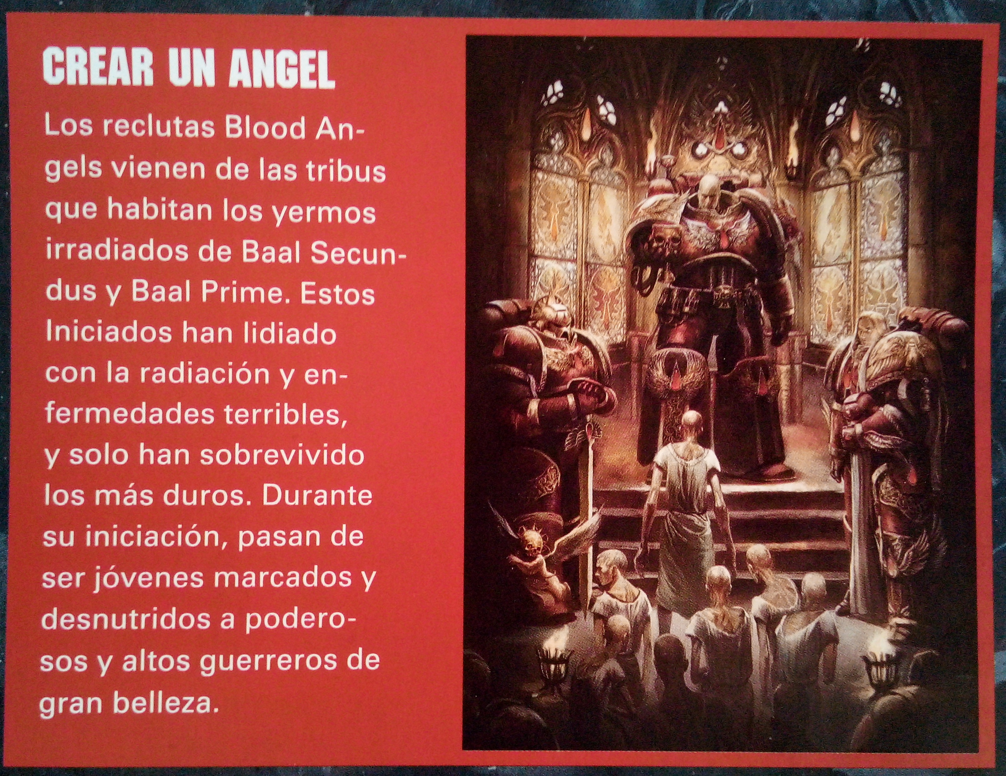 «Baal, el planeta natal de los Blood Angels, se encontraba asediado bajo una enorme armada de naves Tyranid. Se arremolinaba en los cielos y ocultaba las estrellas. Los Blood Angels contaban con una fuerza de combate de tamaño y fuerza increíbles, pero seguían siendo demasiado pocos.