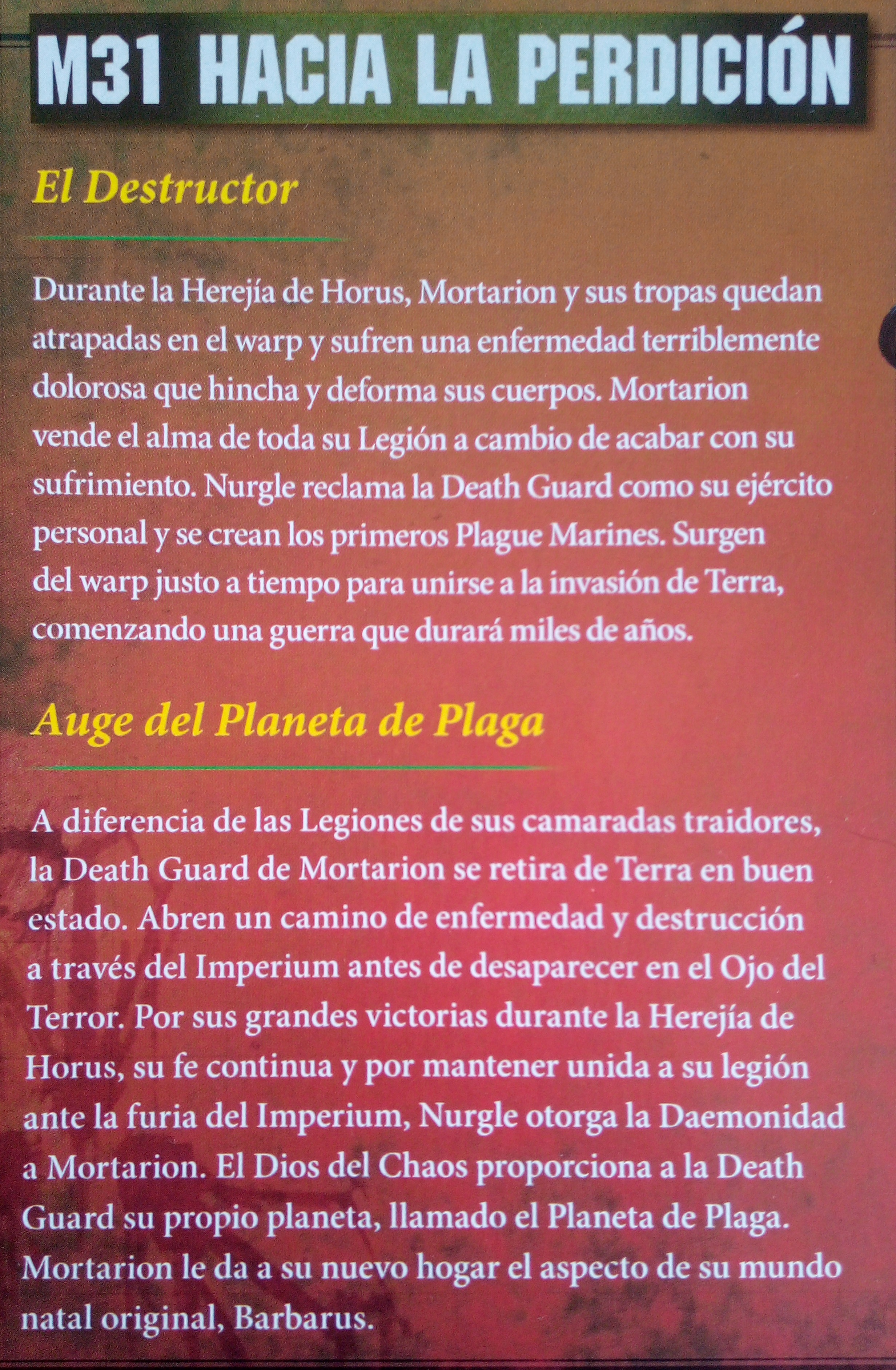 Mortarion es el Primarca Daemon de la Death Guard. Ha jurado lealtad a Nurgle a cambio de los poderes oscuros que él ofrece. Ha asolado la galaxia durante miles de años, aplastando a sus enemigos en el campo de batalla. Su armadura, la barbarana, está en vuelta en una túnica mohosa. En una mano empuña la guadaña mortífera conocida como Silencio. En la otra empuña la Linterna, una pistola de energía alienígena. Envuelto en una nube de moscas y vapor de plaga tóxico desciende al campo de batalla trayendo consigo el hedor de la muerte.