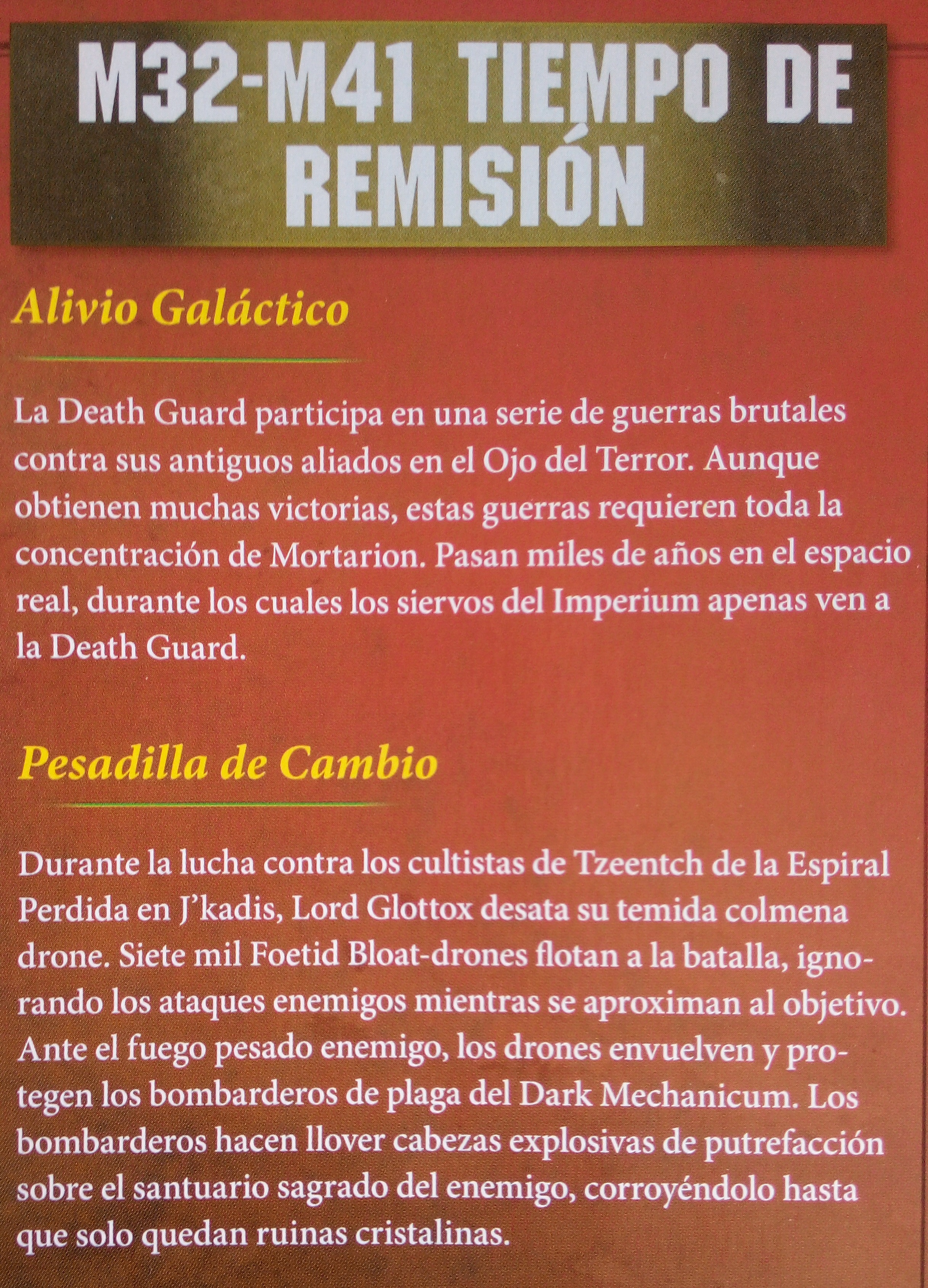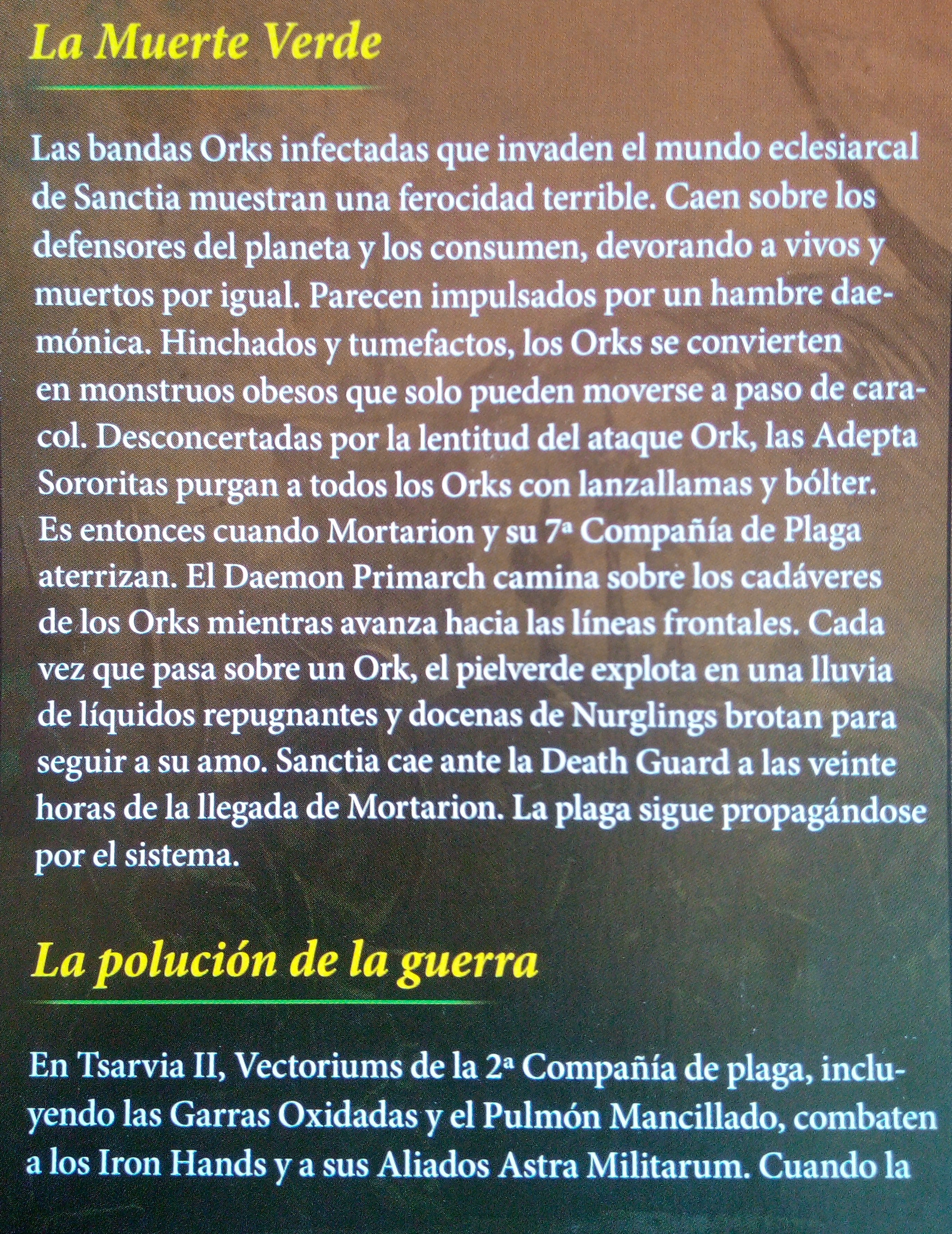Durante diez mil años, la Death Guard ha extendido la plaga y la enfermedad por las estrellas. Incontables ejércitos han sido destruidos o corrompidos bajo su avance. Su registro de batalla es largo y está lleno de relatos de hechos horribles. Estas son algunas de sus Crónicas de Virulencia.