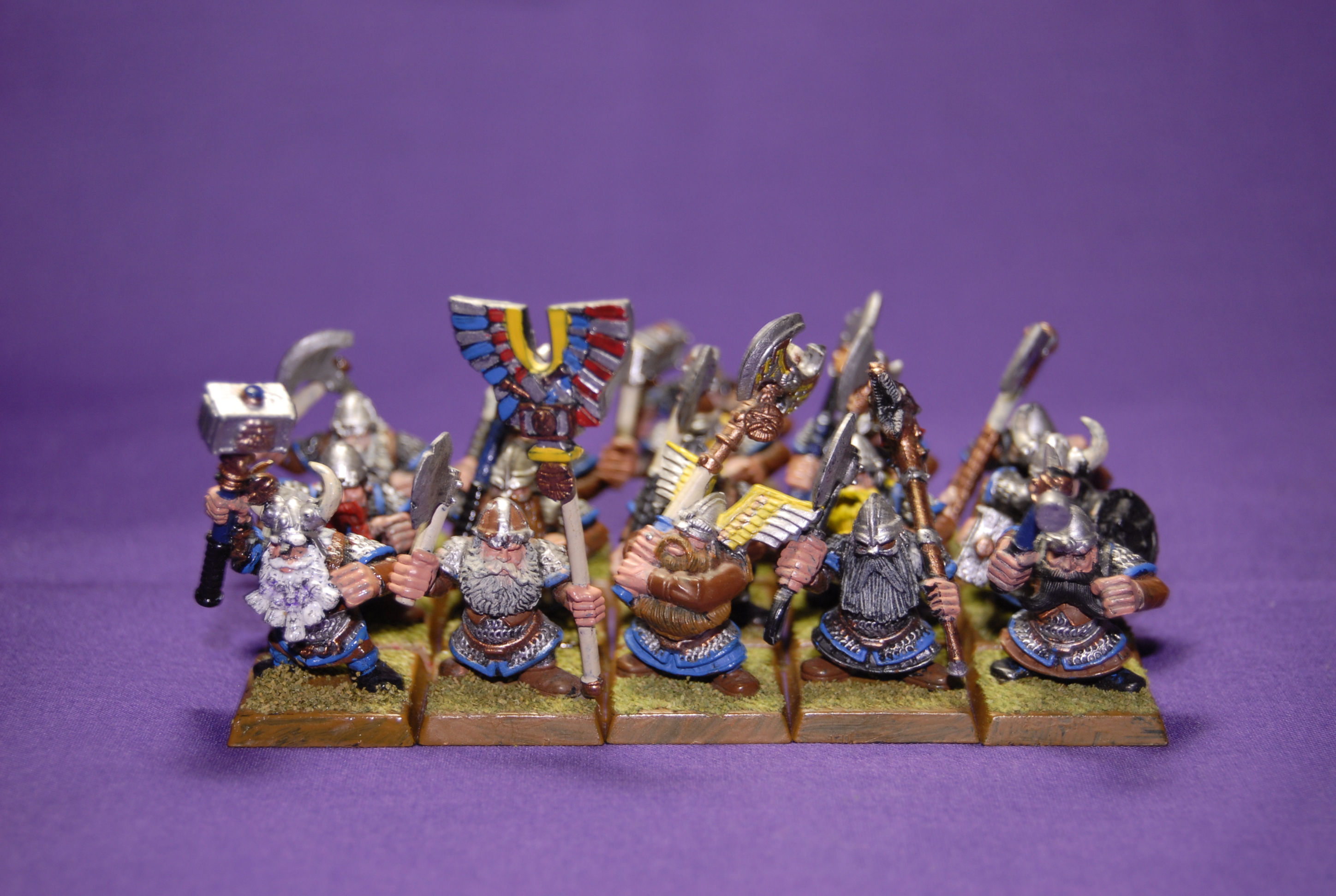 Gracias a que me propuse catalogar y ordenar las miniaturas, dí con algo que, no es que estuviese perdido, si no que hacía tiempo que no me paraba a contemplar. Y creo que es mas que necesario hacerlo de vez en cuando. Se trata de la primera unidad de enanos que pinté.