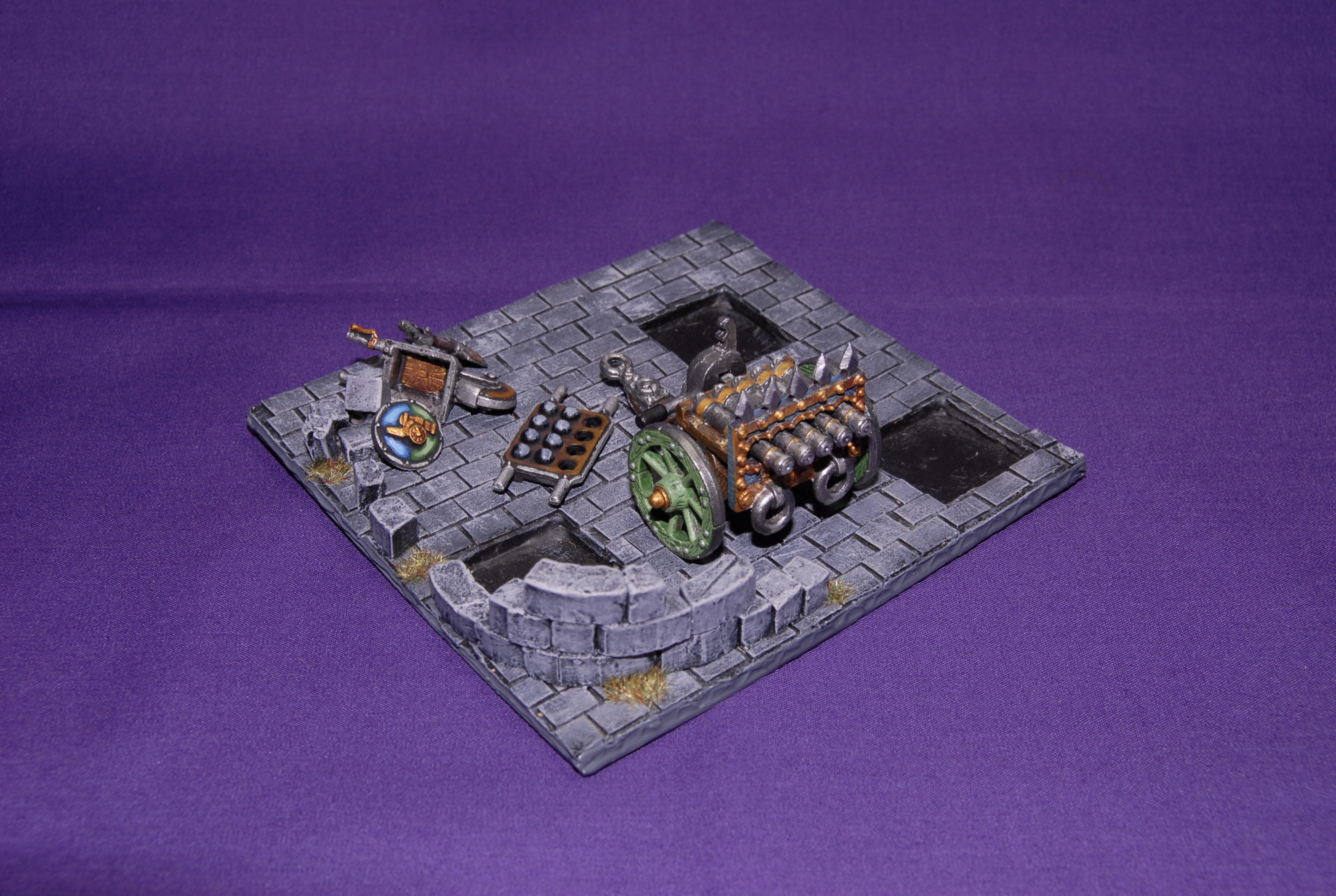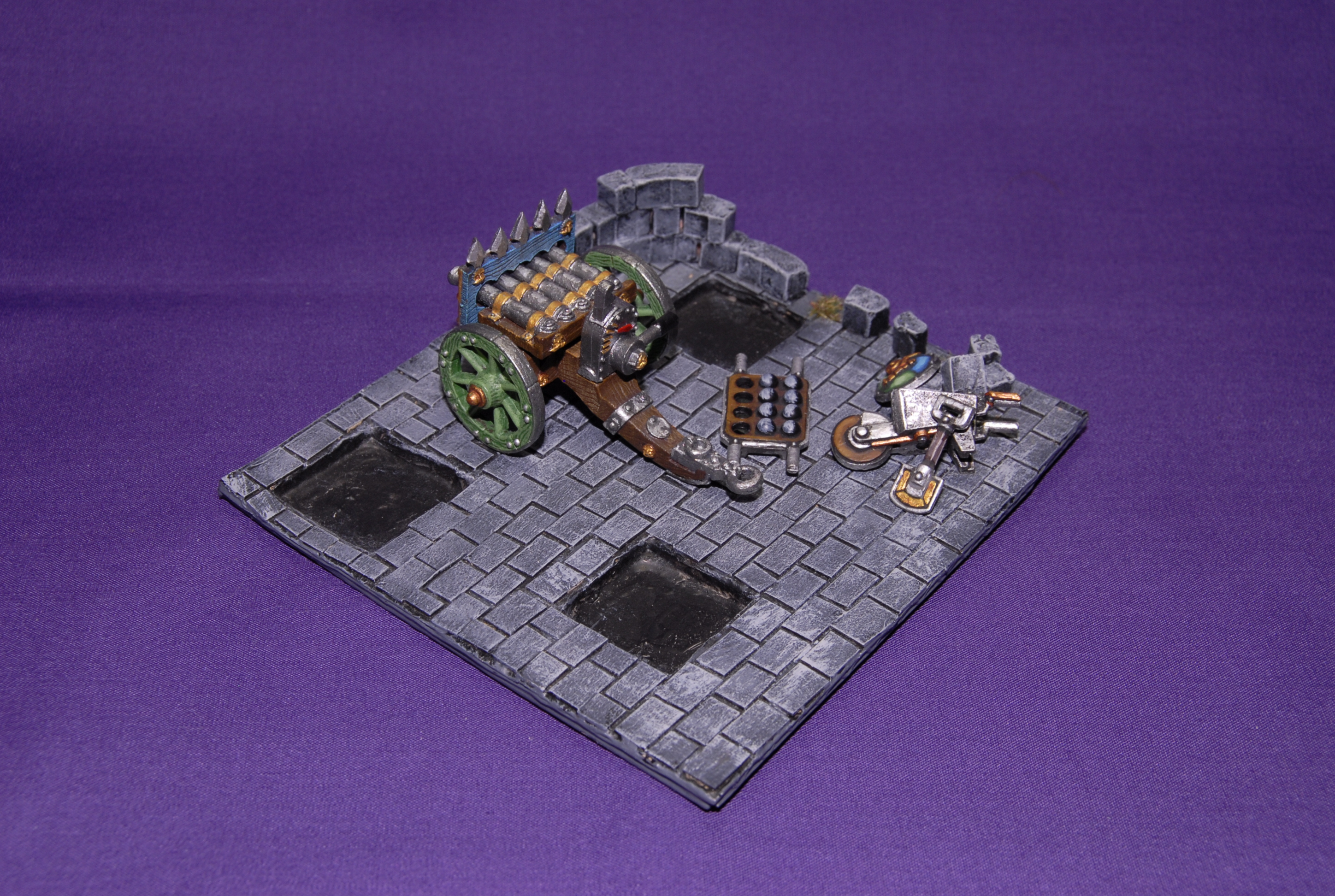Para esta miniatura me regodeé un poco más y le hice una pequeña peana escénica, la cual, como la gran mayoría de peanas del ejercito, representa una pequeña zona enladrillada con el cañón parapetado detrás de un pequeño muro medio derruido.
