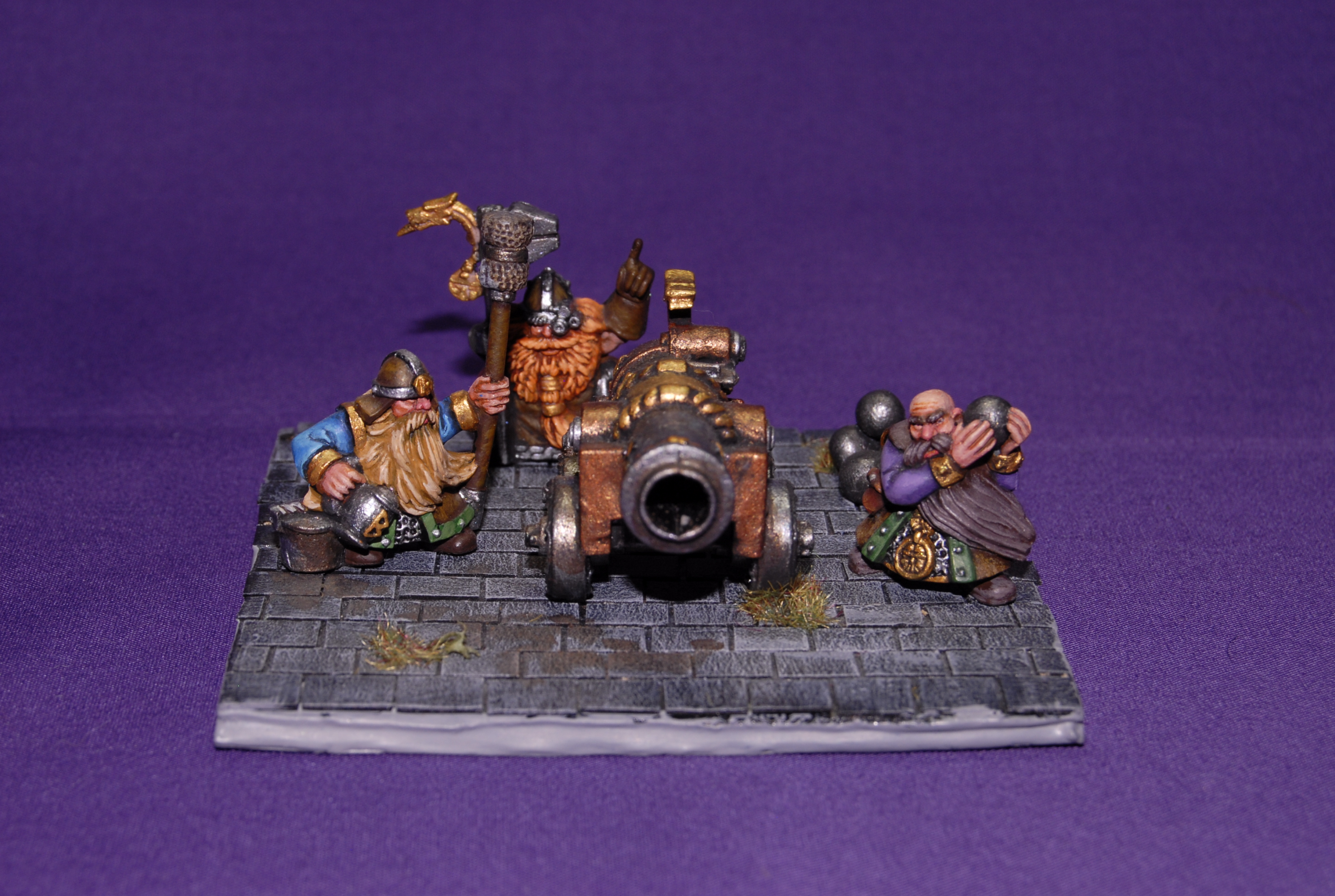 Para esta ocasión tenemos un cañón del Paso de la Calavera. La verdad es que las miniaturas de esa caja dejaron mucho que desear por el lado de los enanos, de hecho son las peores de la gama, pero creo que de todas, el cañón es la que más se salva. Puede que el cañón en si mismo sea un poco pequeño y no sea la mejor miniatura, pero la dotación de esta máquina de guerra la verdad es que me gusta bastante.