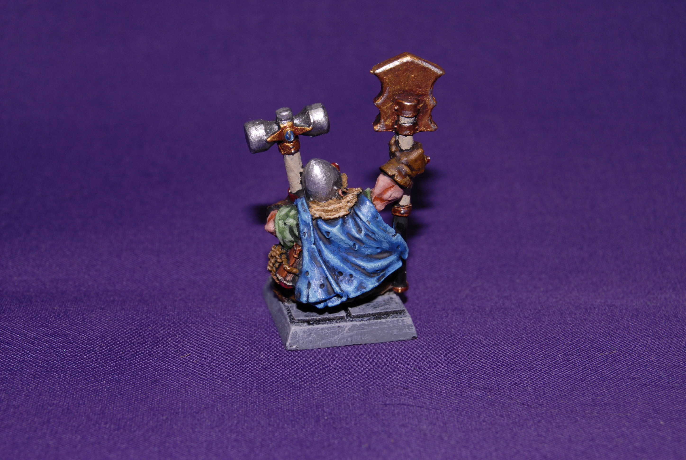 En su momento, cuando me hice con la miniatura no lo sabía y lo pinté para este ejercito, cosa de lo que no me arrepiento porque creo que es una de las miniaturas más bonitas de toda la fortaleza. Y es que durante mucho tiempo se estuvo vendiendo como herrero rúnico genérico cuando fue concebido para una campaña muy especial, la cual ya hemos mencionado anteriormente, y es la de «La venganza de Drong».
